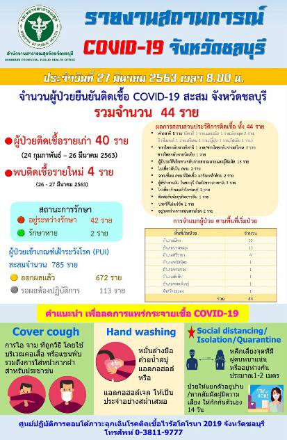 ด้าน จ.ชลบุรี จำนวนผู้ป่วยยืนยันติดเชื้อสะสมรวม 44ราย โดย อ.เมือง พบผู้ติดเชื้อมากสุดถึง 22 ราย รองลงมาคือ อ.บางละมุง จำนวน 13 ราย ศรีราชา 4 ราย ส่วนพนัสนิคม พานทอง สัตหีบ และหนองใหญ่ อำเภอละ 1 ราย และยังมีผู้ป่วยที่ จ.ระยอง ทำงานใน ต.บ่อวิน อ.ศรีราชา อีก 1 ราย