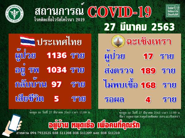 ส่วนสถานการณ์โดยรวมของจังหวัดวันที่ 27 มี.ค. 2563 มีผู้เข้าเกณฑ์ส่งตรวจหาเชื้อจำนวน 53 ราย ตรวจไม่พบเชื้อ 49 ราย รอผลตรวจอีก 1 ราย
