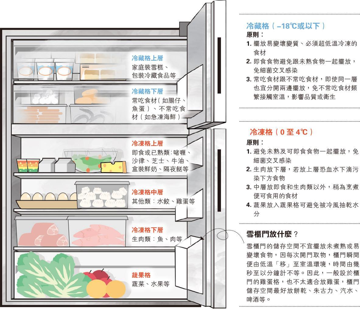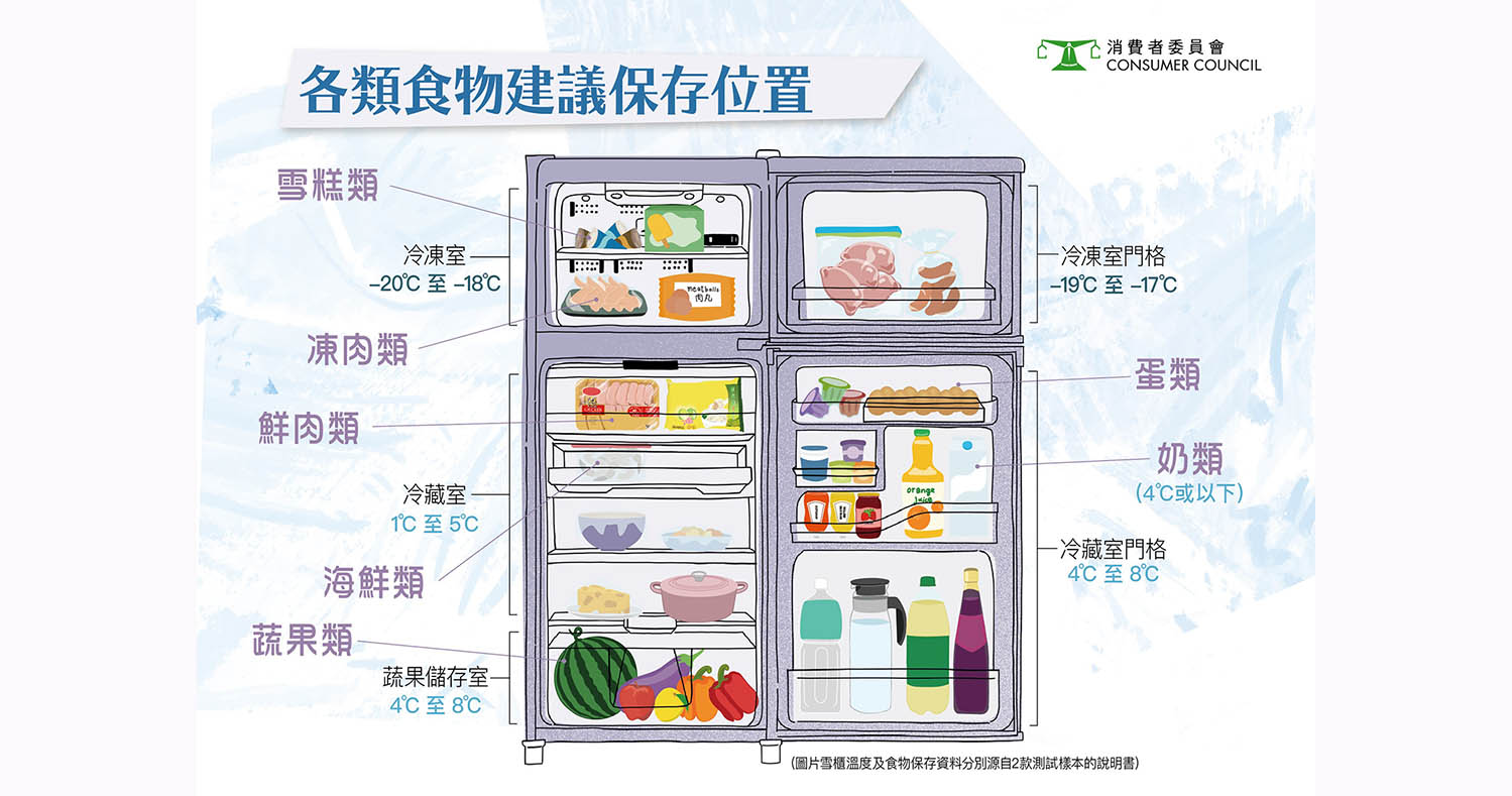 不同食物放入雪櫃,放哪個位置較佳?消委會根據部分雪櫃說明書內容,綜合建議不同食物類別的存放位置及適合溫度。此外,食安中心亦不時提醒,生的食物與熟食要分開存放,注意勿讓生的食物污染熟食。【詳情】