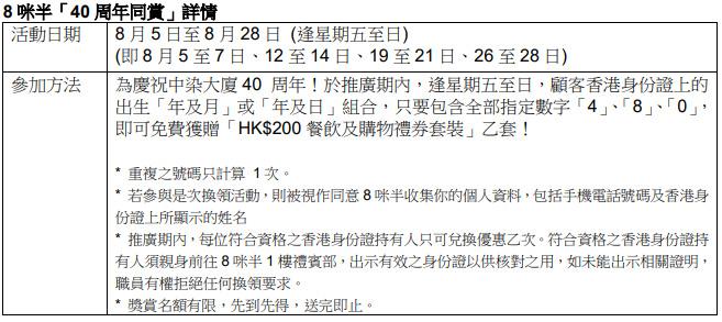 中染大廈「8咪半」特設三重連環消費賞。第一賞「仲夏消費獎賞禮遇」:即日至9月12日以電子消費滿指定金額,可獲賞「伴你飲」硅藻土杯墊或「伴你遊」多功能摺疊式收納箱。第二賞「消費券加碼賞」:配合消費券發放,即日起以消費券支付工具消費滿$1800,額外獲賞$100禮券。壓軸大賞「40周年同賞」:顧客身分證出生日期有齊指定數字「4」、「8」和「0」,可免費獲贈$200禮券。