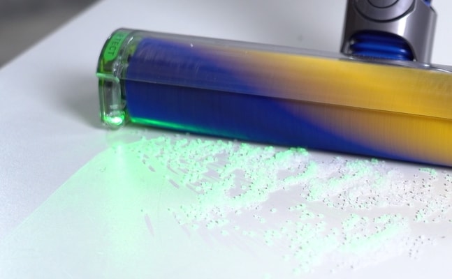 用家大部份時間都用肉眼檢視地上的塵粒,再用吸塵機吸去。Dyson 就在 V12 Detect Slim 加入含有雷射二極管的 Fluffy 吸頭,發出綠色雷射光,令用家更容易辨識地面上的微粒。