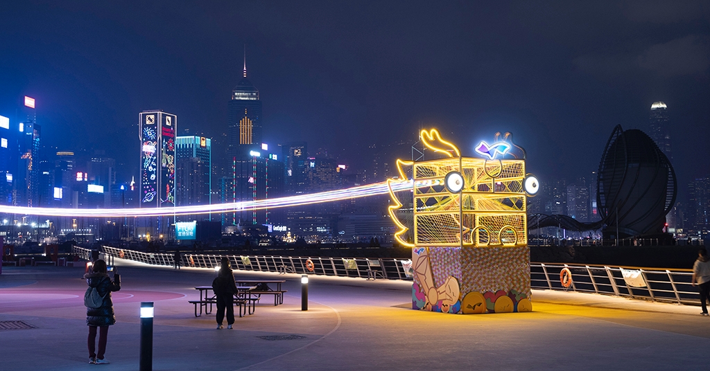 逾120米長「游龍維港」沉浸式編織藝術裝置中,高達5米的龍頭裝置配搭鱗光及色彩繽紛的龍身躍動維港。龍頭裝置內另有乾坤,由擅長編織的本地年青藝術家馬穎汶,結合繩結和建築,以幾何交錯的編織技術,創作與別不同的沉浸式空間體驗。共運用10種顏色合共逾1.6公里繩編織出彩龍頭,傳承編織工藝文化。龍身以5種顏色合共逾1.25公里LED燈帶連結場地上的5個戶外裝置,寓意香港龍騰四海,風生水起。