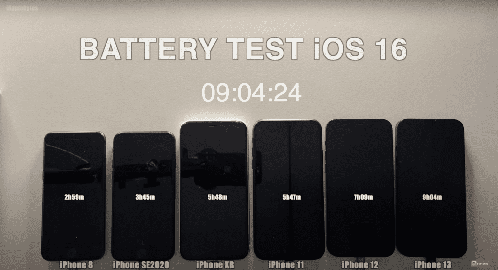 外國 YouTube 頻道 iAppleBytes 早前以 iPhone 8、iPhone SE 2020、iPhone XR、iPhone 11、iPhone 12 及 iPhone 13,共 6 款舊型號的 iPhone ,再配合 Geekbench 來測試 iOS 16 正式版的電池由滿電至完全耗盡的續航時長。