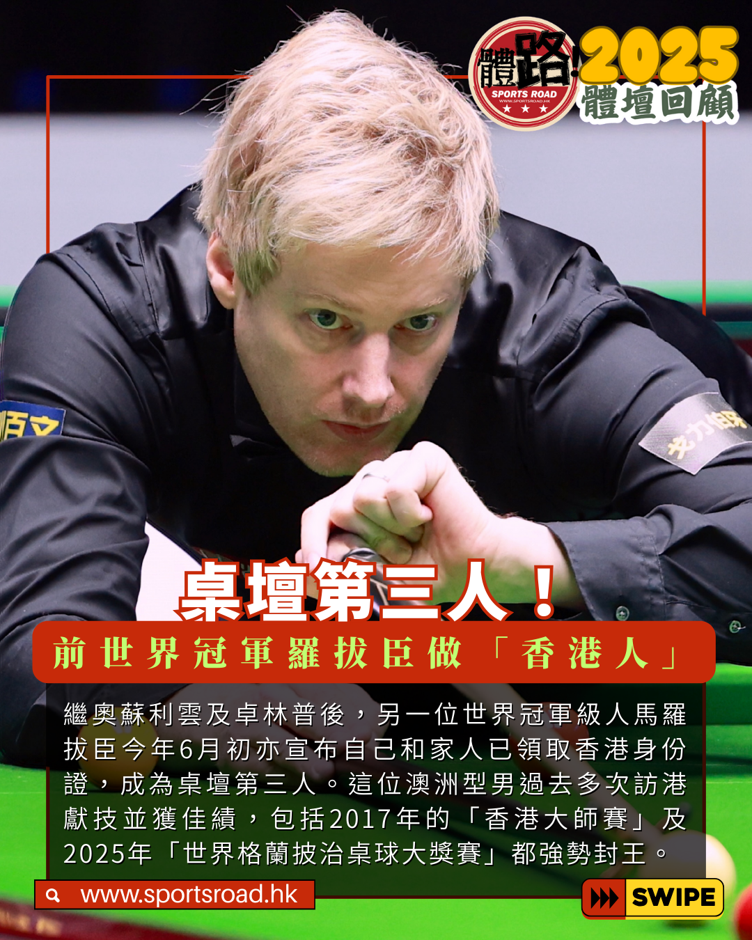 【體路專題】香港桌球壇2025年渡過了豐盛的一載。在體育委員會調整機制下終於保留A級精英行列,暫時解除降級危機,令總會及運動員都放下心頭大口,而且不論英式或美式球員都繼續在國際舞台上發光發熱,當中「四眼Cue后」吳安儀事隔2年重奪職業巡迴賽資格更屢創佳績;「神童」廖予生再度稱霸英國分齡賽,矢志成為職業球手。此外,香港闊別36年再辦排名賽,雖然揭幕日發生「趕客風波」但瑕不掩瑜,最終由羅拔臣封王,這位澳洲型男不久後更隨奧蘇利雲及卓林普步伐成為「香港人」。