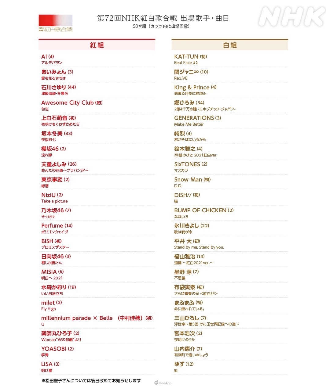 日本 NHK 每年年末慣例播送的「日本紅白歌唱大賽」是個人人耳熟能詳的節目,雖然有些人會因為覺得紅白是個年代久遠的節目而不感興趣,但近年來在有年輕世代歌手加入的狀況下,也替這個老字號注入了新的活水。且 NHK 在昨(21)日公佈的「第72屆NHK紅白歌合戦」曲目列表當中,也多了不少近年備受矚目的新面孔!