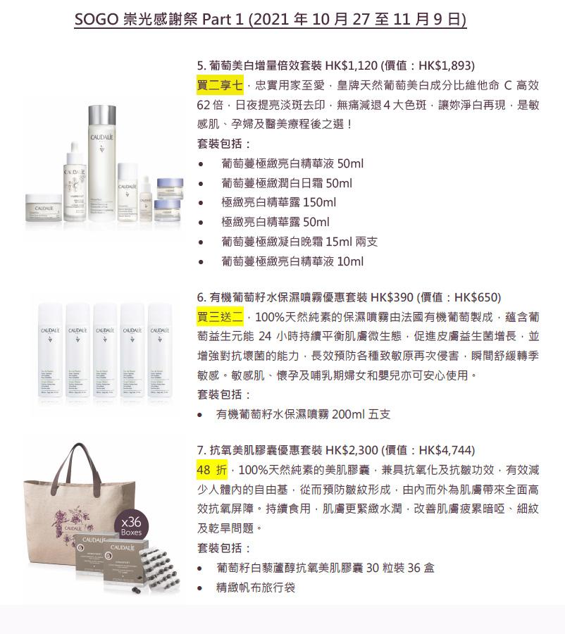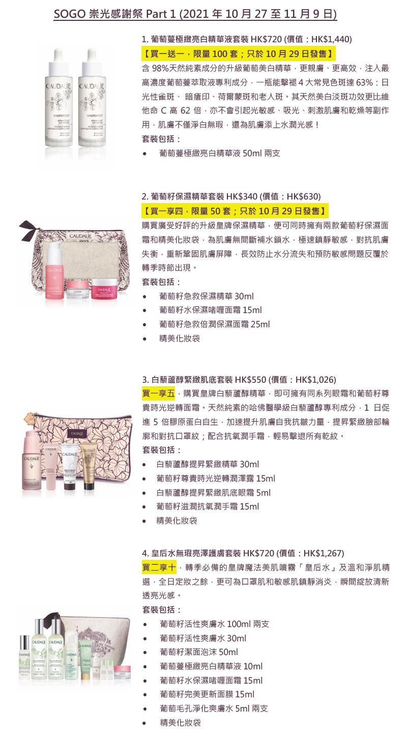 SOGO崇光感謝祭10月13日至12月5日舉行,Caudalie會分三階段(Part 1:10月27至11月9日、Part 2:11月10至23日、Part 3:11月24至12月5日)將更環保、更天然高效、更潔淨無害的升級版葡萄護膚產品,組合成多款最優惠套裝,亦會推出多項額外購物禮遇,讓女士們可以滿載而歸之外,亦有助解決所有令人困擾的肌膚問題。所有套裝數量有限,售完即止。(部分優惠詳情見附圖)
