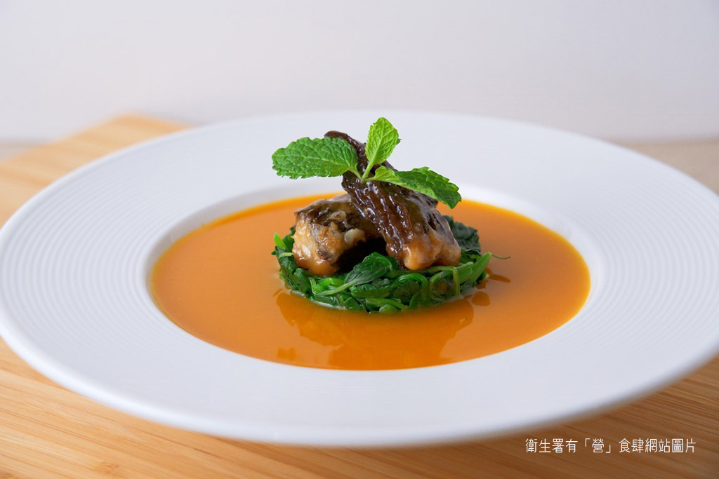 製法︰羊肚菌浸1-2小時至軟身,洗淨。燒熱鑊,倒1/3茶匙油。莧菜放進鑊中加鹽炒約數分鐘,加水煮至熟透,備用。倒進餘下的油,快炒洋葱1-2分鐘,備用。鮮淮山肉、南瓜肉蒸6-8分鐘,再分開壓成茸。拌勻淮山茸和洋葱,釀入羊肚菌。以慢火把60毫升上湯煮至濃稠,放進羊肚菌,讓羊肚菌吸收上湯味道,稍後取出。南瓜茸放入餘下的上湯,加熱煮成金湯。碟上先放莧菜,再把羊肚菌置上,最後加入金湯即成。衛生署有「營」食肆網站食譜