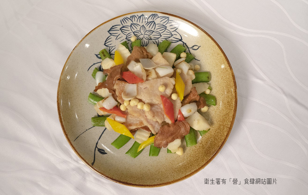 製法︰甜豆切段,彩椒切角,甜豆、榆耳、百合、鮮淮山及茨實汆水,瘦黑豚肉汆水,備用。鑊燒熱下油,煎香瘦黑豚肉。將所有已汆水材料、彩椒、鹽和糖加入鑊中,快炒即可。衛生署有「營」食肆網站食譜