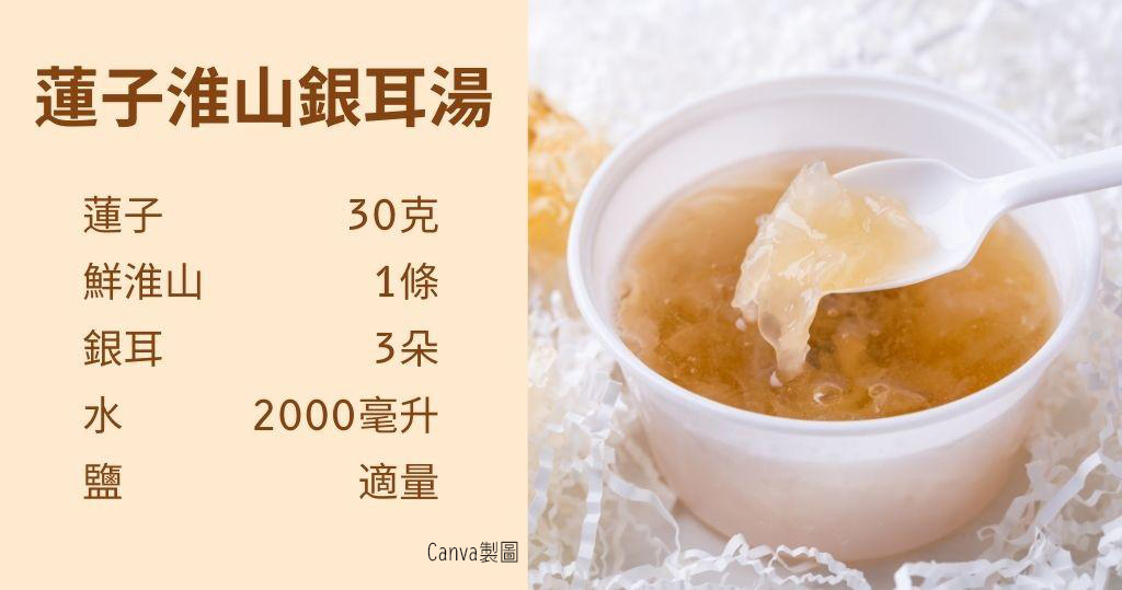製法:蓮子和銀耳洗淨,分別浸水15分鐘,備用。淮山去皮切件。全部材料煮1.5小時,即成。