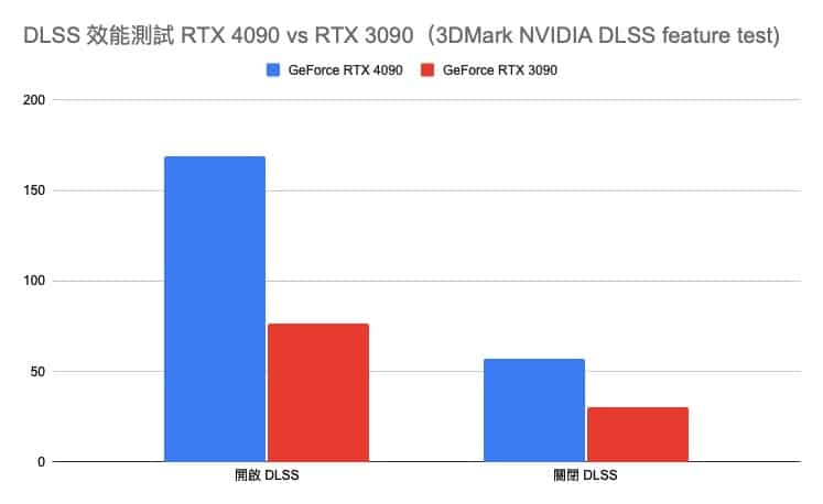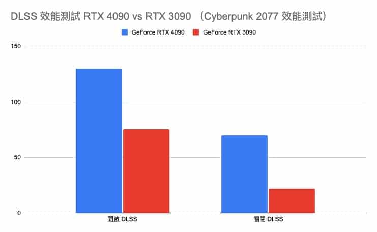 DLSS 效能測試 RTX 4090 vs RTX 3090 DLSS 效能測試(平均FPS) GeForce RTX 4090 GeForce RTX 3090 開啟 DLSS 130 75 關閉 DLSS 70 22