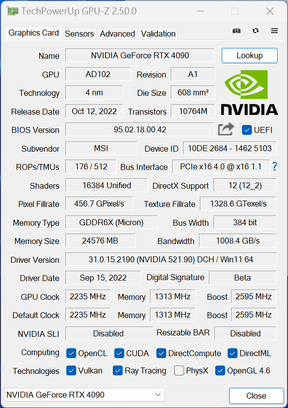 利用 GPU-Z 軟件顯示了此卡製程為 4nm,Shaders 數量增至 16384 個核心,比對 RTX 3090 多了接近 60%。公版卡的基礎時脈為 2235MHz,記憶體時脈為 1313MHz,而 Boost 時脈則為 2520MHz,比起其他廠的產品會略低,當然這也是一向公版卡的特色。首批卡記憶體比對上代同樣用上 24GB,但記憶體頻寬就由 936GB/s 增至約 1000GB/s。
