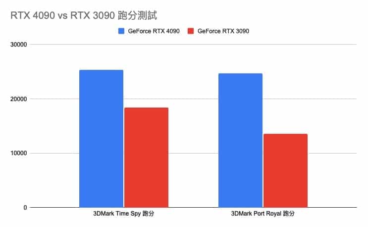 RTX 4090 vs RTX 3090 跑分測試 3DMark跑分 GeForce RTX 4090 GeForce RTX 3090 3DMark Time Spy 跑分 25369 18388 3DMark Port Royal 跑分 24664 13548