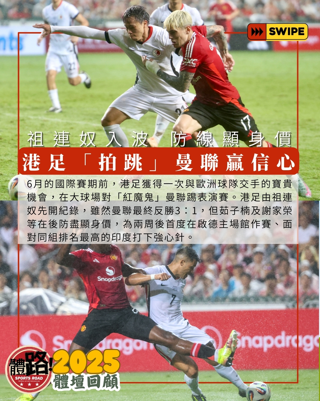 6月的國際賽期前,港足獲得一次與歐洲球隊交手的寶貴機會,在大球場對「紅魔鬼」曼聯踢表演賽。港足由祖連奴先開紀錄,雖然曼聯最終反勝3:1,但茹子楠及謝家榮等在後防盡顯身價,為兩周後首度在啟德主場館作賽、面對同組排名最高的印度打下強心針。