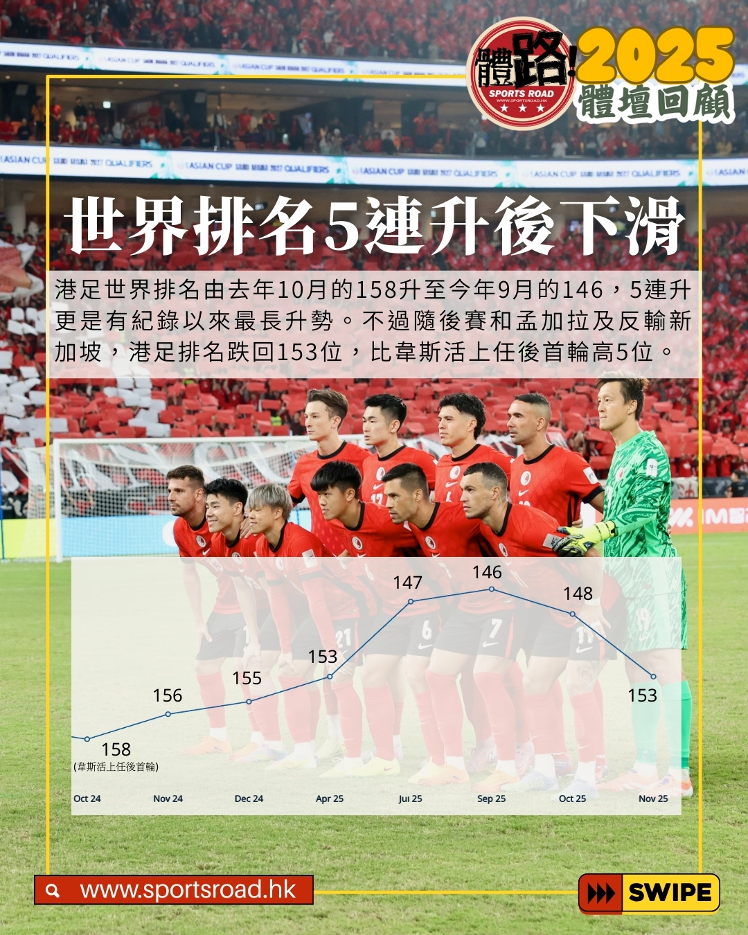 港足世界排名由去年10月的158升至今年9月的146,5連升更是有紀錄以來最長升勢。不過隨後賽和孟加拉及反輸新加坡,港足排名跌回153位,比韋斯活上任後首輪高5位。