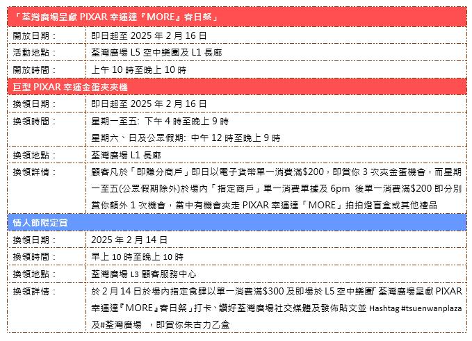 荃灣廣場「PIXAR幸運達『MORE』春日祭」舉行中(詳情),情人節除了可以與情人甜蜜蜜打卡之外,還有機會獲得sweet爆禮遇情人節限定賞:2月14日消費滿$300、即場在L5空中樂園「荃灣廣場呈獻PIXAR幸運達『MORE』春日祭」打卡、讚好荃灣廣場社交媒體,以及發布貼文並hashtag #tsuenwanplaza 及 #荃灣廣場,可獲朱古力一盒。網址:www.tsuenwanplaza.com.hk 註:資料以主辦方最新公布為準