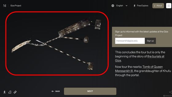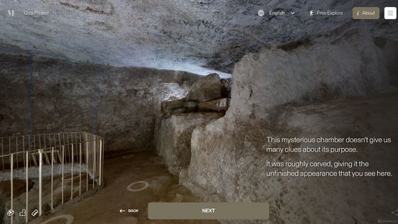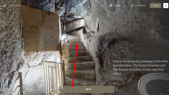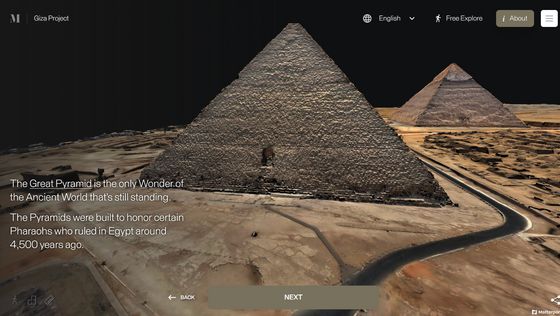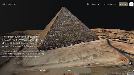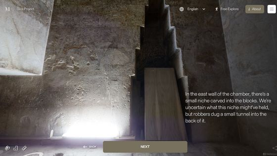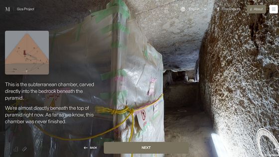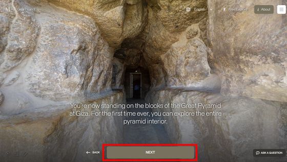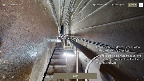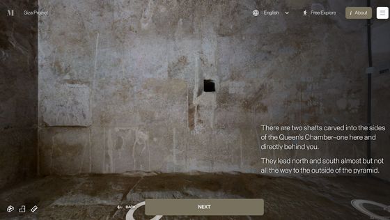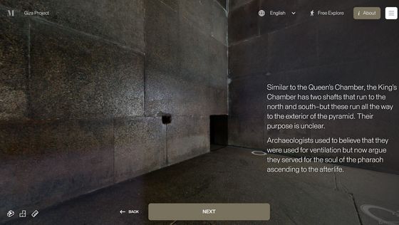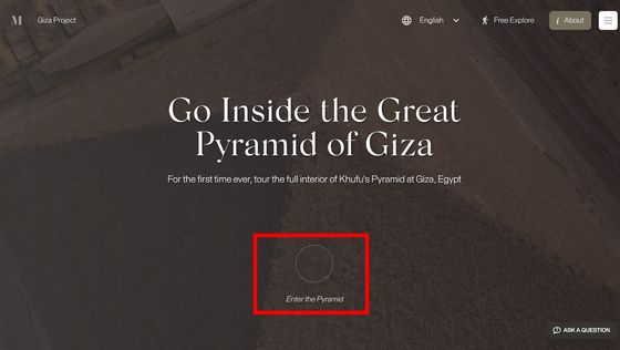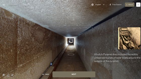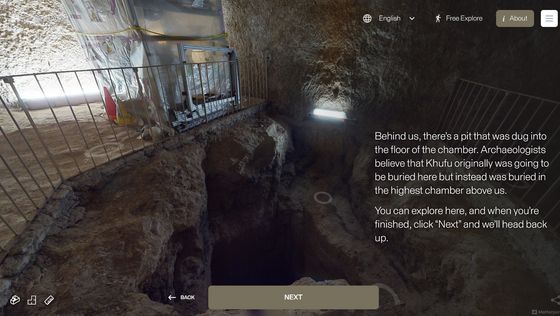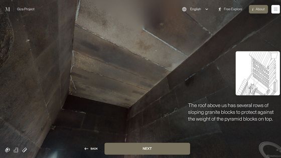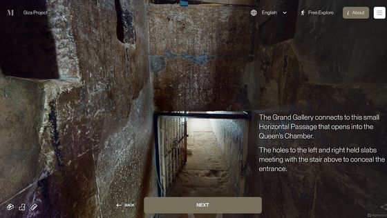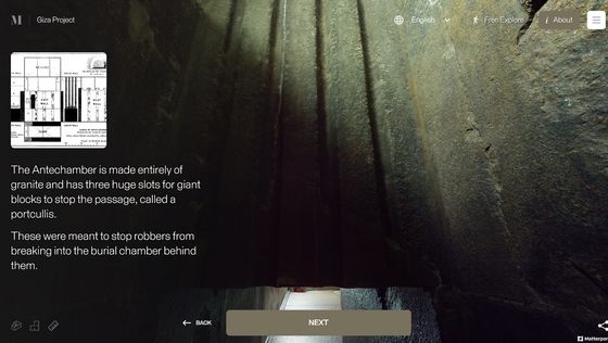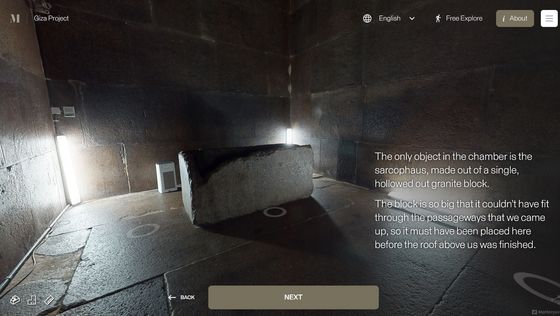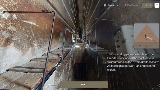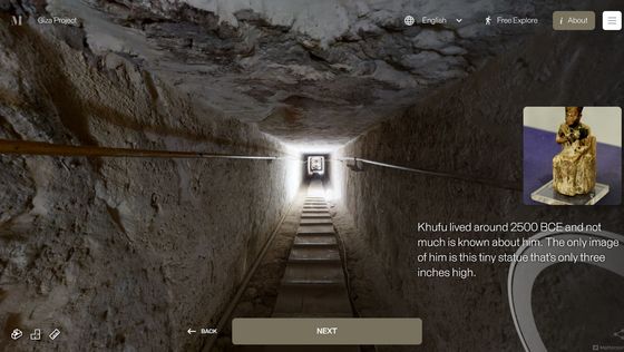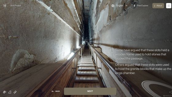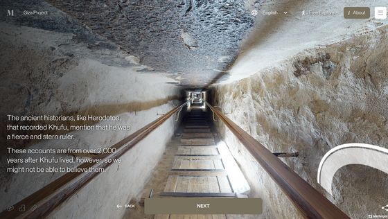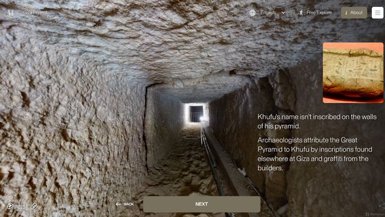 網站「 Inside the Great Pyramid」顯示的 3D 掃描影像是由哈佛大學 Giza Project 提供,訪客進入網站後需點擊網站底部的「進入金字塔」以進入下一頁。當訪客的視點移動到金字塔入口前,網站會顯示「你現正站在古夫金字塔的磚塊上。是歷史上第一次可以探索整個金字塔的內部。」再點擊「下一步」便能展開旅程。