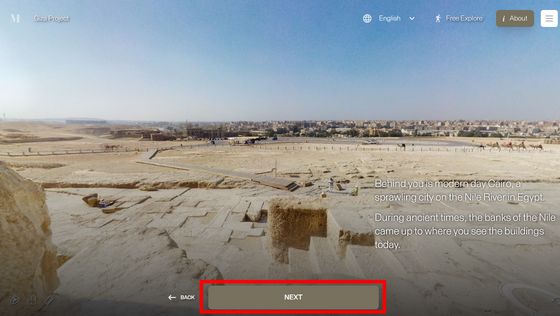 之後便會看到埃及首都開羅的城市景觀,畫面上顯示著有關尼羅河的資料,訪客可選擇改變視角及位置,或按「下一步」繼續參觀。