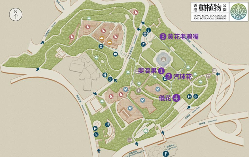 做好防疫措施想逛公園賞賞花?香港動植物公園列有每月開花植物,附有花卉位置圖,有助大家前往探索花花世界。5月開花的植物有:斐濟果、汽球花、黃花老鴉嘴和儀花。