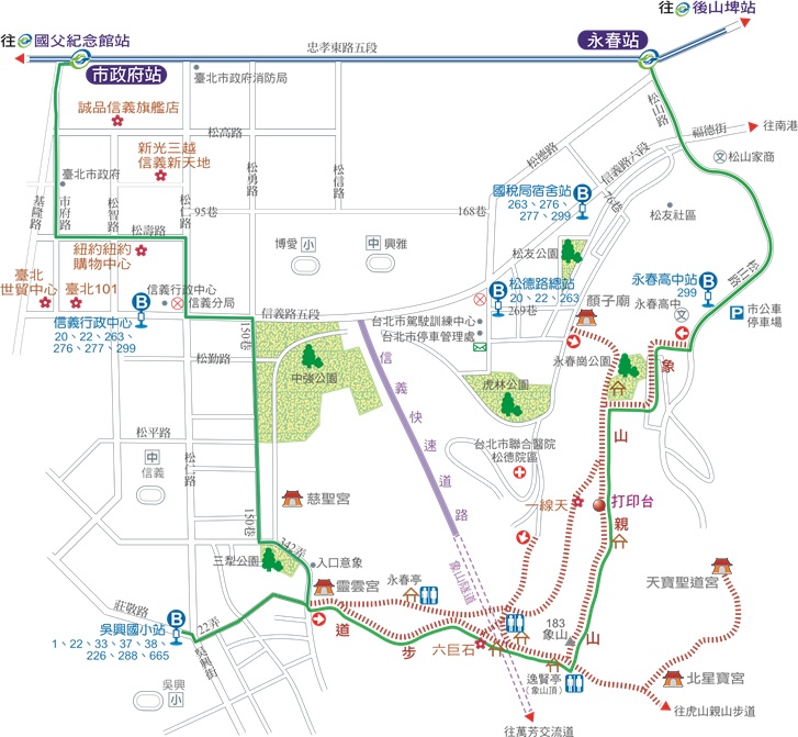 交通: 捷運象山站下車,往信義路五段中強公園方向步行,約10分鐘抵150巷22弄登山口,或; 捷運永春站下車,往松山路永春高中方向步行,約25分鐘抵永春崗公園。