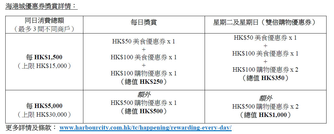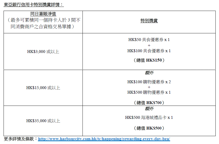 推廣期內憑東亞銀行信用卡於海港城簽帳及參與Rewarding Every Day活動,可享額外購物及美食優惠券及$500海港城禮品卡,每次簽帳可換領高達$9500基本及$1350特別獎賞,回贈總值高達$10,850。