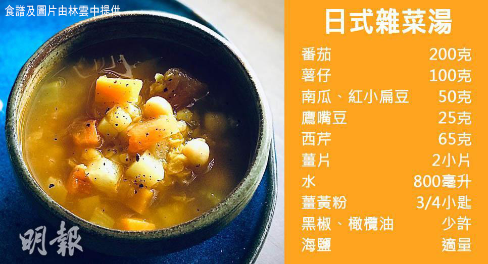 材料:番茄 200克、薯仔 100克、南瓜及紅小扁豆 各50克、鷹嘴豆 25克、西芹 65克、薑片 2小片、水 800毫升、薑黃粉 3/4小匙(1小匙約5毫升)、海鹽 適量、黑椒及橄欖油 少許