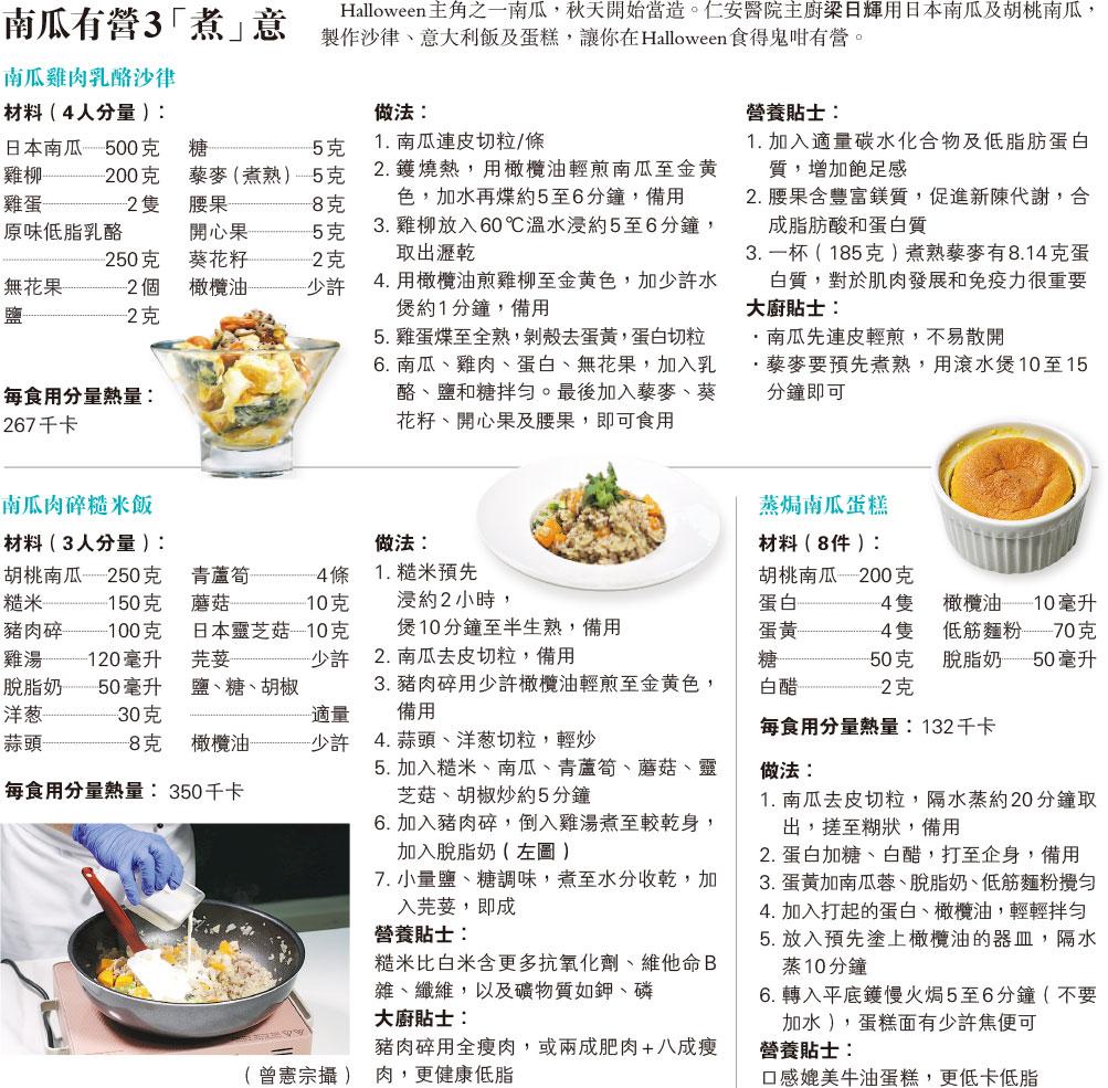 十八.南瓜雞肉乳酪沙律 十九.南瓜肉碎糙米飯 二十.蒸焗南瓜蛋糕