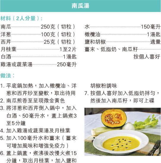 ‧護膚、保護上呼吸道──進食南瓜後,身體會將胡蘿蔔素轉化維他命A,有助平衡皮膚油脂分泌,保持皮膚健康;以及保護上呼吸道(鼻腔、喉嚨、氣管位置),阻止細菌和病毒入侵。