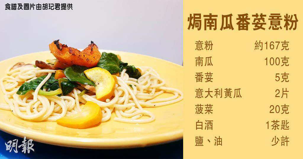 材料:意粉 1/3包(約167克)、南瓜 100克、番荽 5克、意大利黃瓜 2片、菠菜 20克、白酒 1茶匙、鹽及油 少許