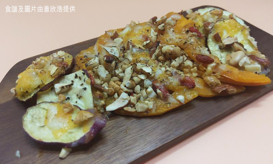 材料:韓國南瓜 110克、日本番薯 60克、杞子 10粒、車打芝士碎及水牛芝士碎 各20克、雜果仁 30克、橄欖油 少許、鹽 適量、黑椒 適量、雜香草 適量