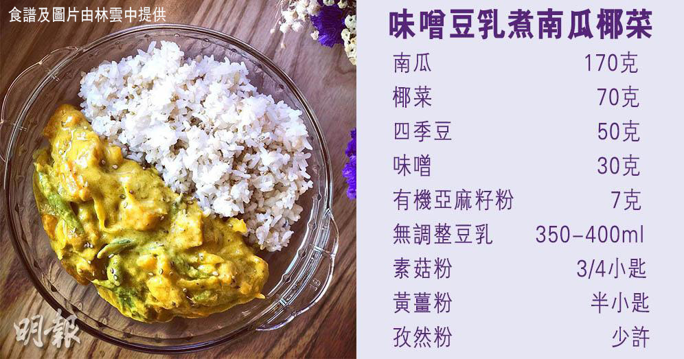 醬汁材料︰味噌 30克、有機亞麻籽粉 7克、孜然粉 少許、素菇粉 3/4小匙(1小匙約5毫升)、黃薑粉 半小匙、無調整豆乳 350至400毫升