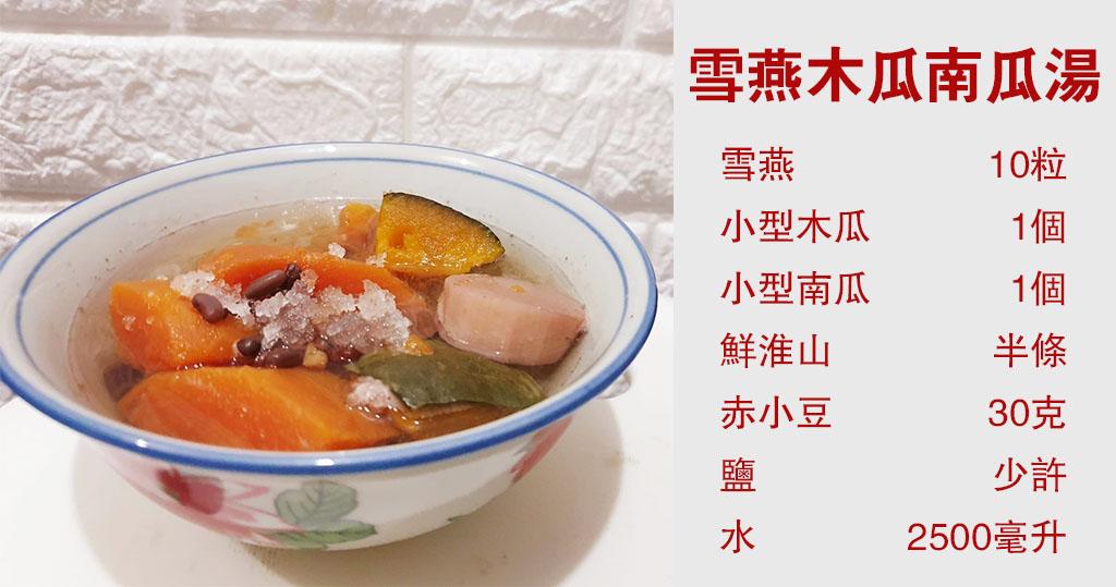 材料︰雪燕 10粒、木瓜(小型) 1個、南瓜(小型) 1個、鮮淮山 半條、赤小豆 30克、鹽 少許、水 2500毫升