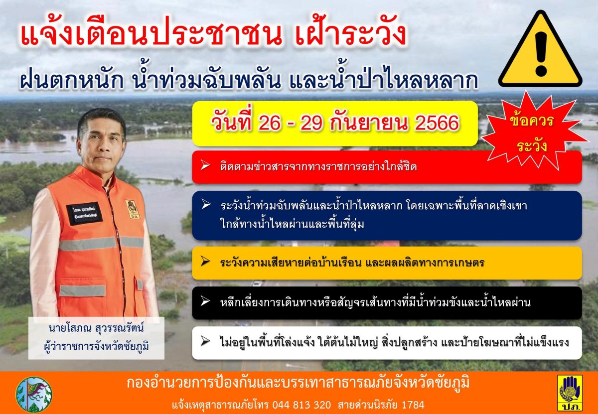 ( 26 ก.ย.66 ) ขณะที่ จ.ชัยภูมิ อิทธิพลของพายุดีเปรสชั่นอ่อนกำลังลงเป็นหย่อมความกดอากาศต่ำกำลังแรง เคลื่อนตัวผ่านประเทศลาว เข้าสู่ภาคอีสาน หรือภาคตะวันออกเฉียงเหนือ ส่งผลให้เกิดฝนตกหนักเป็นบริเวณกว้างใน จ.ชัยภูมิ มาตั้งแต่ช่วงเช้าที่ผ่านมาเกิดฝนตกหนักติดต่อกันมาต่อเนื่องตลอดทั้งวัน โดยเฉพาะบนเทือกเขาภูแลนคา