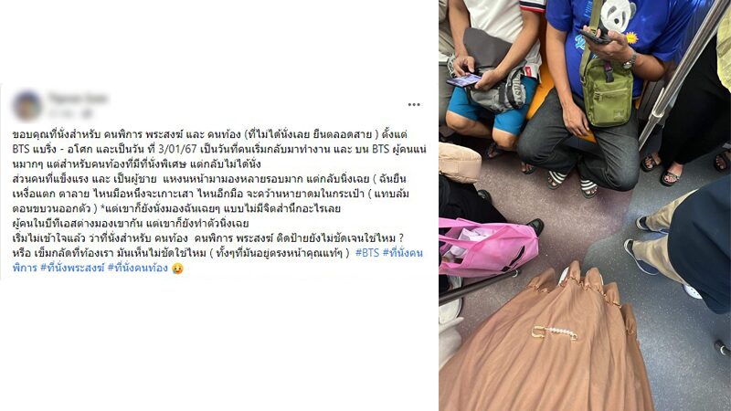 โดยผู้ใช้เฟซบุ๊กรายนี้โพสต์ข้อความว่า "ขอบคุณที่นั่งสำหรับ คนพิการ พระสงฆ์ และ คนท้อง (ที่ไม่ได้นั่งเลย ยืนตลอดสาย ) ตั้งแต่ แบริ่ง - อโศก และเป็นวัน ที่ 3 ม.ค. 67 เป็นวันที่คนเริ่มกลับมาทำงาน และ บนรถไฟฟ้า ผู้คนแน่นมาก ๆแต่สำหรับคนท้องที่มีที่นั่งพิเศษ กลับไม่ได้นั่ง"