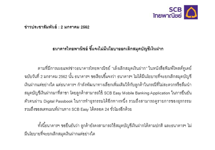 “ตามที่มีการเผยแพร่ข่าวธนาคารไทยพาณิชย์ “เล็งเลิกสมุดเงินฝาก” นั้น ธนาคารฯ ขอเรียนชี้แจงว่า ธนาคารฯ ไม่ได้มีนโยบายที่จะยกเลิกสมุดบัญชีเงินฝากแต่อย่างใด แต่ธนาคารฯ กำลังพัฒนาทางเลือกเพิ่มเติมให้กับลูกค้าในกรณีที่ไม่สะดวกหรือลืมนำสมุดบัญชีเงินฝากมาที่สาขา โดยลูกค้าสามารถใช้ SCB Easy Mobile Banking Application ในการยืนยันตัวตนผ่าน Digital Passbook ในการทำธุรกรรมได้อีกทางหนึ่ง รวมถึงสามารถดูรายการของธุรกรรม รวมถึงขอสเตทเมนท์ผ่านทาง SCB Easy ได้ตลอด 24 ชั่วโมงอีกด้วยทั้งนี้ธนาคารฯ ขอยืนยันว่า ลูกค้ายังคงสามารถใช้สมุดบัญชีเงินฝากได้ตามปกติ และธนาคารฯ ไม่มีนโยบายที่จะยกเลิกสมุดเงินฝากแต่อย่างใด”