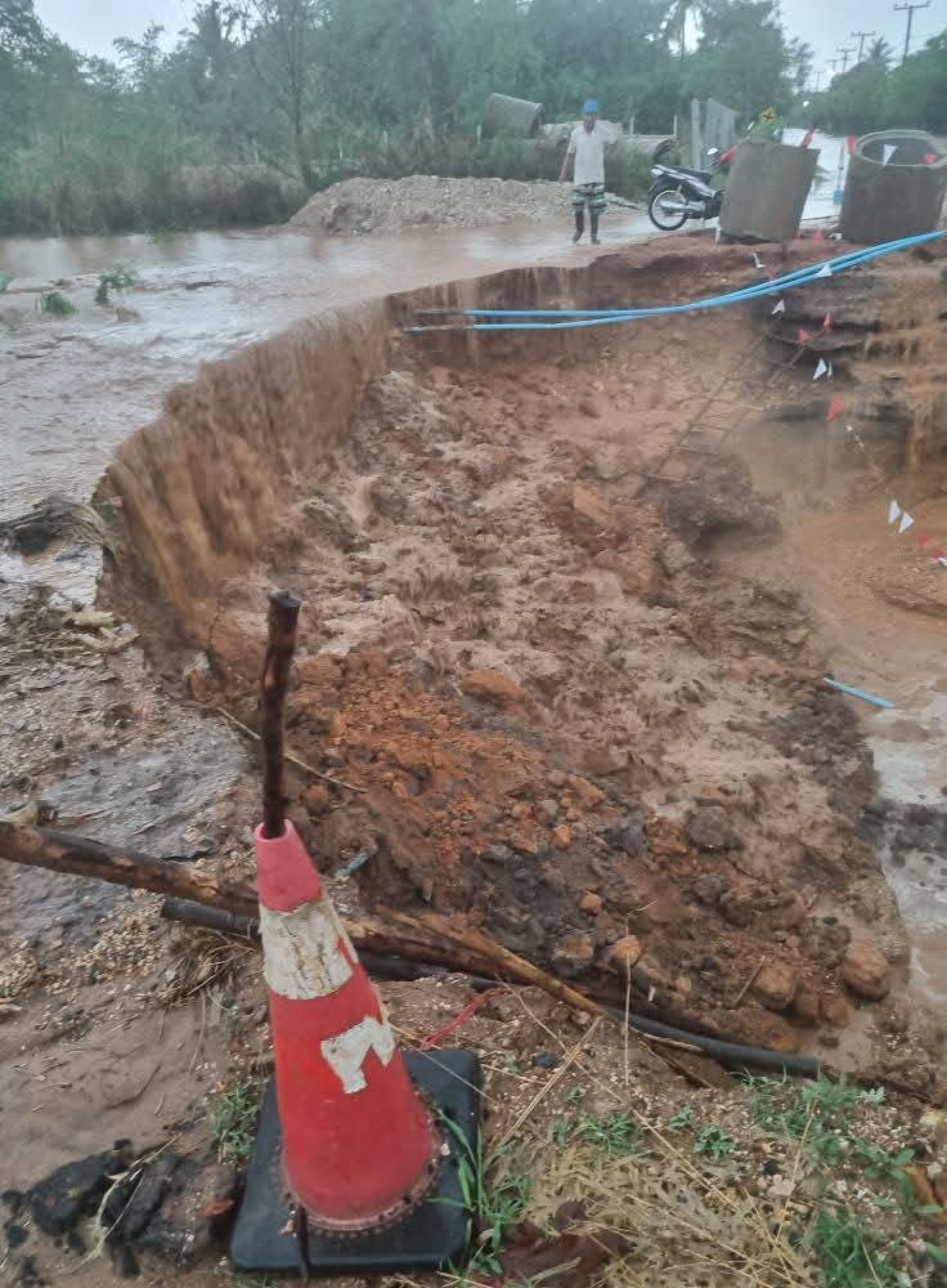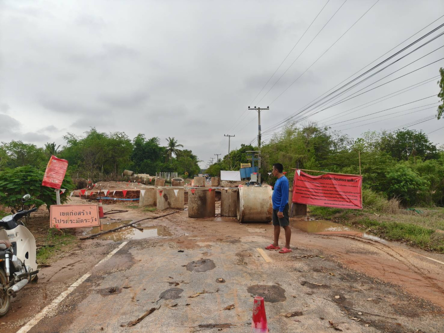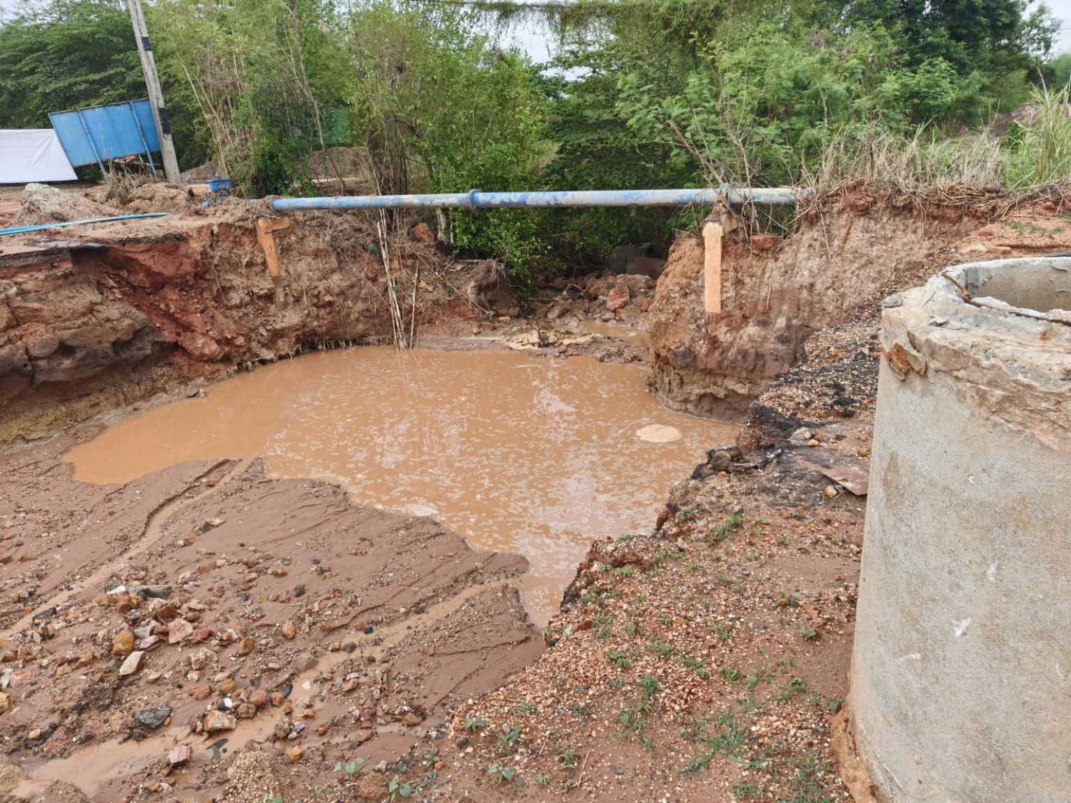 วันที่ 30 มีนาคม 2568 ผู้สื่อข่าวรายงาน ว่า ในพื้นที่หลายอำเภอของ จ.นครราชสีมา ได้เกิดฝนตกหนักตั้งแต่ช่วงค่ำและต่อเนื่องตลอดทั้งวัน ทำให้น้ำกัดเซาะถนนบ้านดอนไทร หมู่ 9 ต.หนองยาง อ.เฉลิมพระเกียรติ ซึ่งเป็นถนนองค์การบริหารส่วนจังหวัดนครราชสีมา (อบจ.นม.) 32301 บ้านโนนเลียบ-บ้านหนองยาง อยู่ระหว่างวางท่อสี่เหลี่ยมคอนกรีตถูกมวลน้ำฝนกัดเซาะจนขาด ชาวบ้านไม่สามารถสัญจรได้ จึงต้องใช้ทางเลี่ยงระหว่างหมู่บ้านเดินทางชั่วคราว ตรวจสอบพบกระแสน้ำได้กัดเซาะดินเป็นแอ่งลึกประมาณ 5 เมตร กว้าง 10 เมตร ผู้นำชุมชนและชาวบ้านช่วยกันนำแผงมาวางกั้น เตือนอันตรายไม่ให้ผ่านเส้นทาง