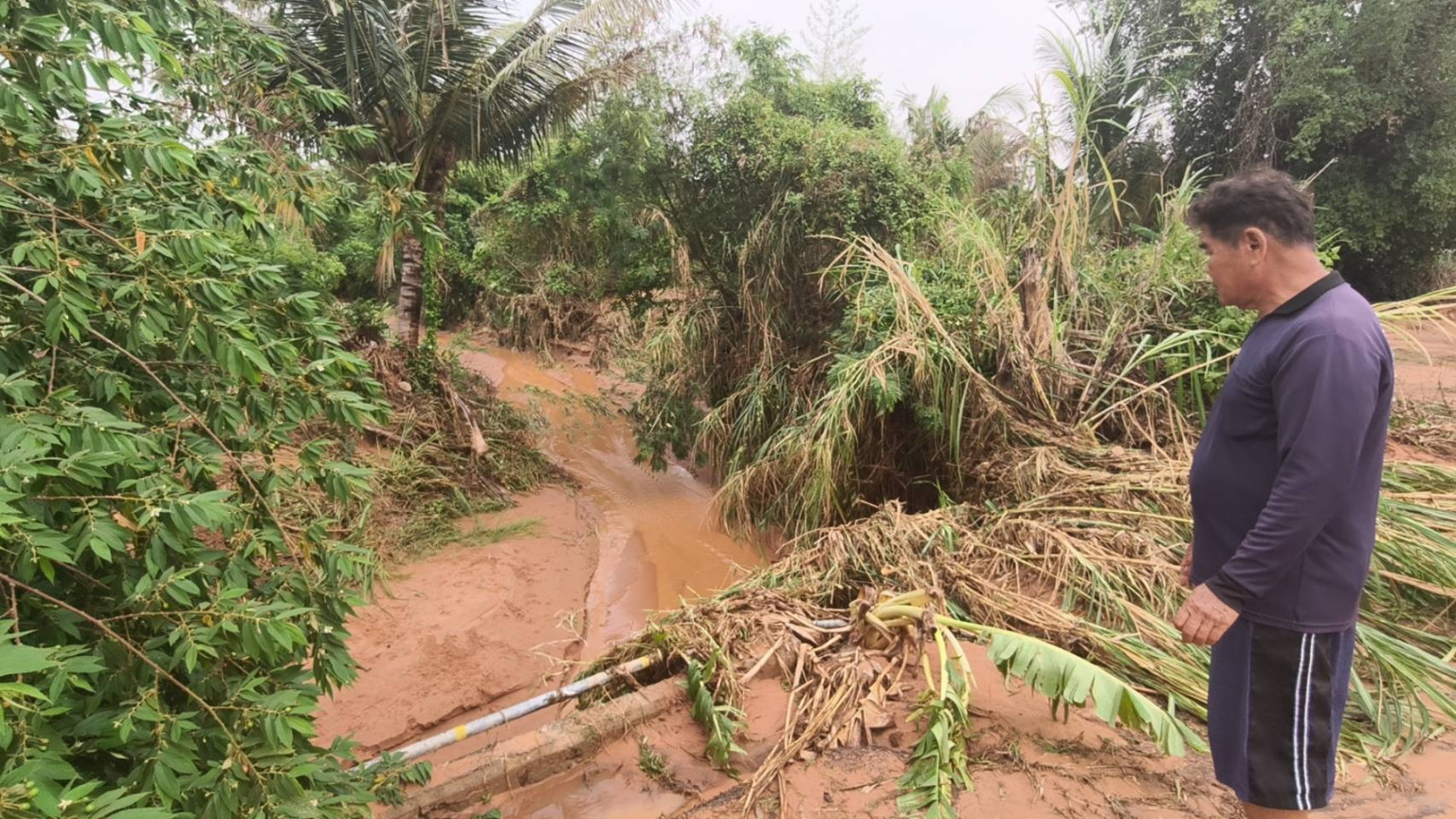 โดยนายนคร หนุนกระโทก ผู้ใหญ่บ้านดอนไทร เปิดเผยว่า จุดเกิดเหตุเป็นจุดรับมวลน้ำจากไร่สวนของเกษตรกรที่มีพื้นที่สูงกว่า จึงมีปัญหากระแสน้ำเซาะเป็นประจำ อบจ.นครราชสีมา จึงแก้ปัญหาโดยวางนำท่อคอนกรีต ช่วยการระบายน้ำแต่ยังไม่แล้วเสร็จถูกน้ำฝนกัดเซาะเสียหายอีก นอกจากนี้บริเวณศาลาประชาคมหมู่บ้าน ซึ่งห่างจากจุดถนนขาดประมาณ 500 เมตร ผิวถนนข้ามร่องน้ำกลางหมู่บ้านถูกกระแสกัดเซาะและพัดเศษขยะ วัชพืชมาปิดปากท่อไม่สามารถระบายน้ำผ่านได้ น้ำได้เอ่อไหลท่วมจนถนนทรุดแล้วกัดเซาะบริเวณผิวถนนทรุด