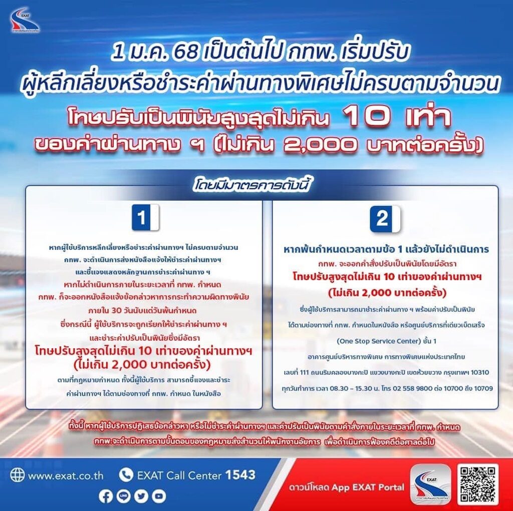 อ่านข่าวต้นฉบับได้ที่ : เริ่ม 1 ม.ค.68 ไม่จ่ายค่าทางด่วน ปรับ 10 เท่า ส่งหนังสือเตือนยังเฉย ส่งฟ้องศาลทันที