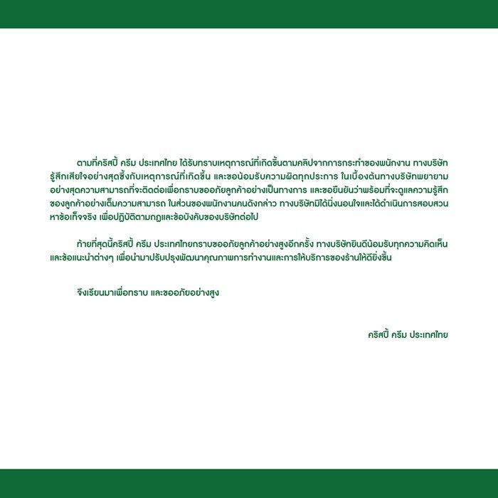บริษัทพยายามอย่างสุดความสามารถ ที่จะติดต่อเพื่อกราบขออภัยลูกค้าอย่างเป็นทางการ และขอยืนยันว่าพร้อมที่จะดูแลความรู้สึก ของลูกค้าอย่างเต็มความสามารถ ในส่วนของพนักงานคนดังกล่าว ทางบริษัทมิได้นิ่งนอนใจและได้ดำเนินการสอบสวน หาข้อเท็จจริง เพื่อปฏิบัติตามกฏและข้อบังคับของบริษัทต่อไป ท้ายที่สุดนี้คริสปี้ ครีม ประเทศไทยกราบขออภัยลูกค้าอย่างสูงอีกครั้งทางบริษัทยินดีน้อมรับ ทุกความคิดเห็น และข้อแนะนำต่างๆ เพื่อนำมาปรับปรุงพัฒนาคุณภาพการทำงานและการให้บริการของร้านให้ดียิ่งขึ้น"