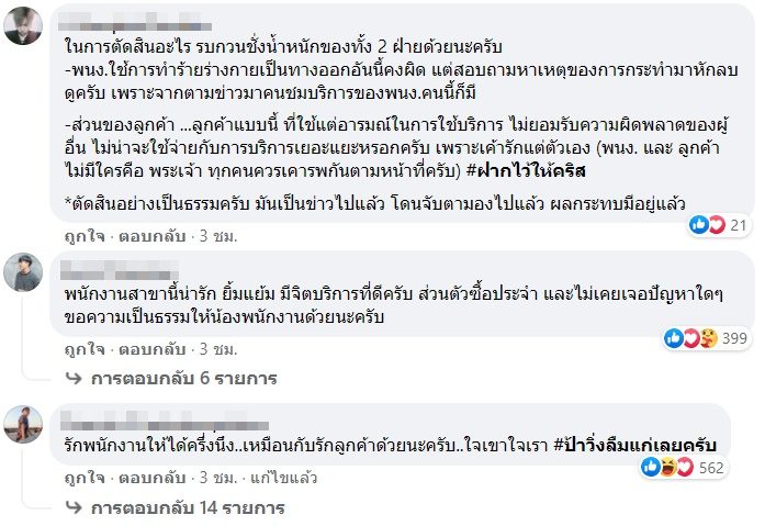 ทั้งนี้ พบว่าชาวเน็ตได้เข้าไปแสดงความคิดเห็นอย่างหนัก และระบุว่า บริษัทควรให้ความเป็นธรรมกับพนักงาน และตรวจสอบเรื่องอย่างถี่ถ้วนก่อนจะลงโทษ และยังแชร์ประสบการณ์ใช้บริการสาขาดังกล่าวว่า พนักงานสุภาพ น่ารัก และเป็นกำลังใจให้กับพนักงานอีกด้วย