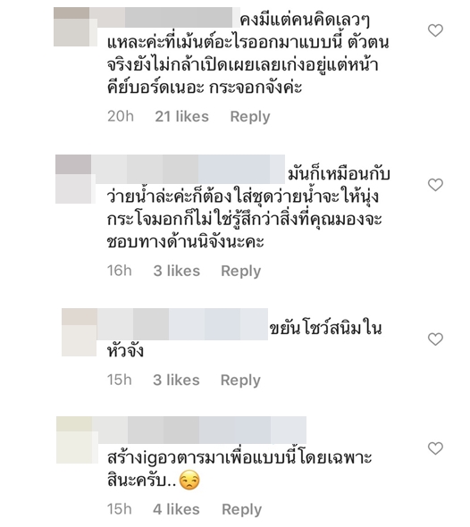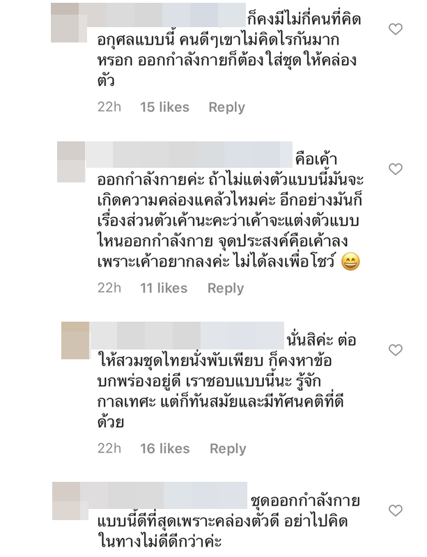 นั่นสิค่ะ ต่อให้สวมชุดไทยนั่งพับเพียบ ก็คงหาข้อบกพร่องอยู่ดี เราชอบแบบนี้นะ รู้จักกาลเทศะ แต่ก็ทันสมัยและมีทัศนคติที่ดีด้วย, ชุดออกกำลังกายแบบนี้ดีที่สุดเพราะคล่องตัวดี อย่าไปคิดในทางไม่ดีดีกว่าค่ะ, คงมีแต่คนคิดเลวๆแหละค่ะที่เม้นต์อะไรออกมาแบบนี้ ตัวตนจริงยังไม่กล้าเปิดเผยเลยเก่งอยู่แต่หน้าคีย์บอร์ดเนอะ กระจอกจังค่ะ ฯลฯ