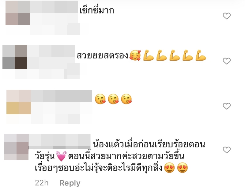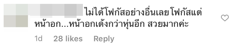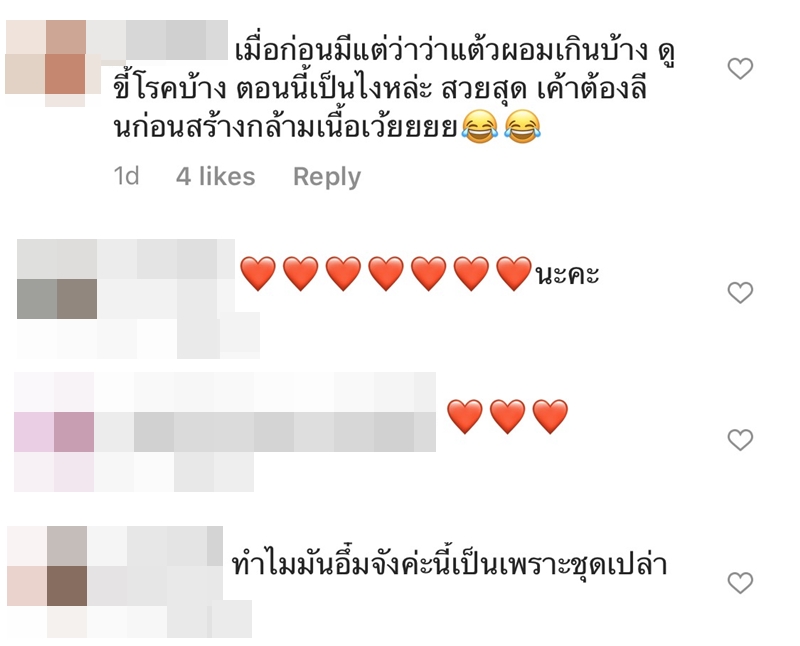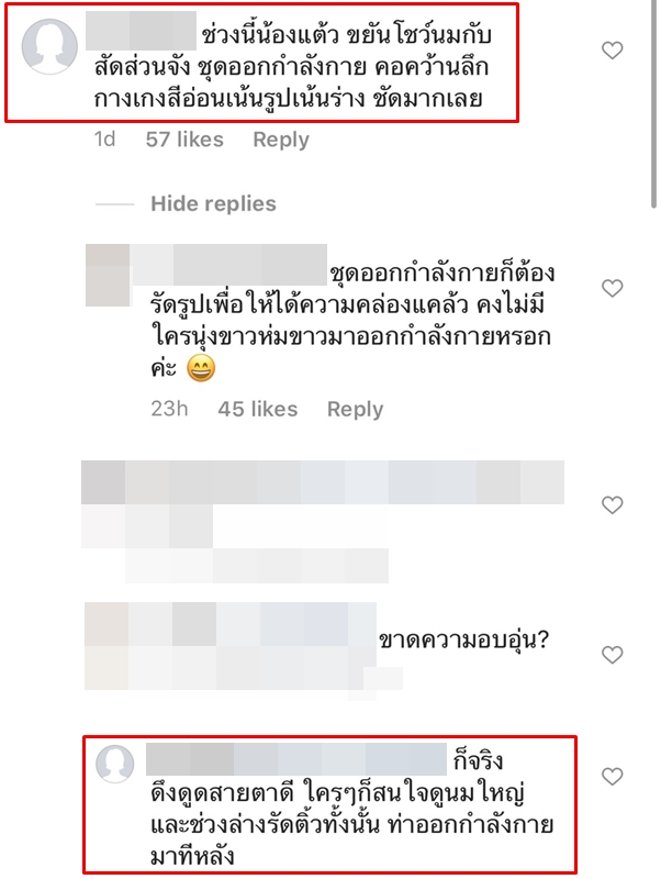 ในขณะเดียวกันมีผู้ใช้ไอจีราย 1-2 รายเข้ามาคอมเมนต์แซะนางเอกสาวว่า“ช่วงนี้น้องแต้ว ขยันโชว์นมกับสัดส่วนจัง ชุดออกกำลังกาย คอคว้านลึก กางเกงสีอ่อนเน้นรูปเน้นร่าง ชัดมากเลย” และ “ก็จริง ดึงดูดสายตาดี ใครๆ ก็สนใจดูนมใหญ่และช่วงล่างรัดติ้วทั้งนั้น ท่าออกกำลังกายมาทีหลัง”