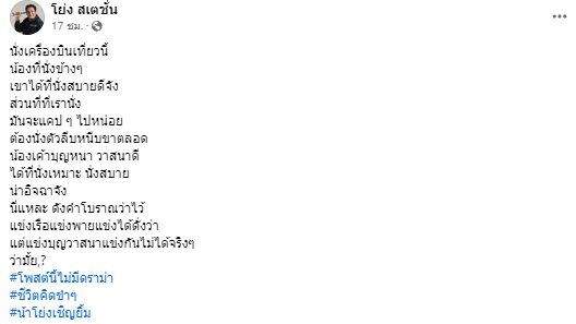 งานนี้ น้าโย่งเผยภาพเหตุการณ์ พร้อมระบุว่า "นั่งเครื่องบินเที่ยวนี้ น้องที่นั่งข้างๆ เขาได้ที่นั่งสบายดีจัง ส่วนที่ที่เรานั่ง มันจะแคป ๆ ไปหน่อย ต้องนั่งตัวลีบหนีบขาตลอด