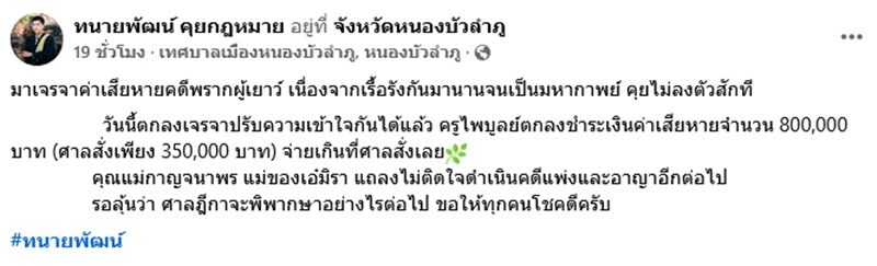 “มาเจรจาค่าเสียหายคดีพรากผู้เยาว์ เนื่องจากเรื้อรังกันมานานจนเป็นมหากาพย์ คุยไม่ลงตัวสักที วันนี้ตกลงเจรจาปรับความเข้าใจกันได้แล้ว ครูไพบูลย์ตกลงชำระเงินค่าเสียหายจำนวน 800,000 บาท (ศาลสั่งเพียง 350,000 บาท) จ่ายเกินที่ศาลสั่งเลย คุณแม่กาญจนาพร แม่ของเอ๋มิรา แถลงไม่ติดใจดำเนินคดีแพ่งและอาญาอีกต่อไป รอลุ้นว่า ศาลฎีกาจะพิพากษาอย่างไรต่อไป ขอให้ทุกคนโชคดีครับ”