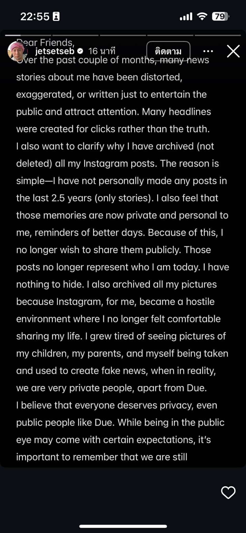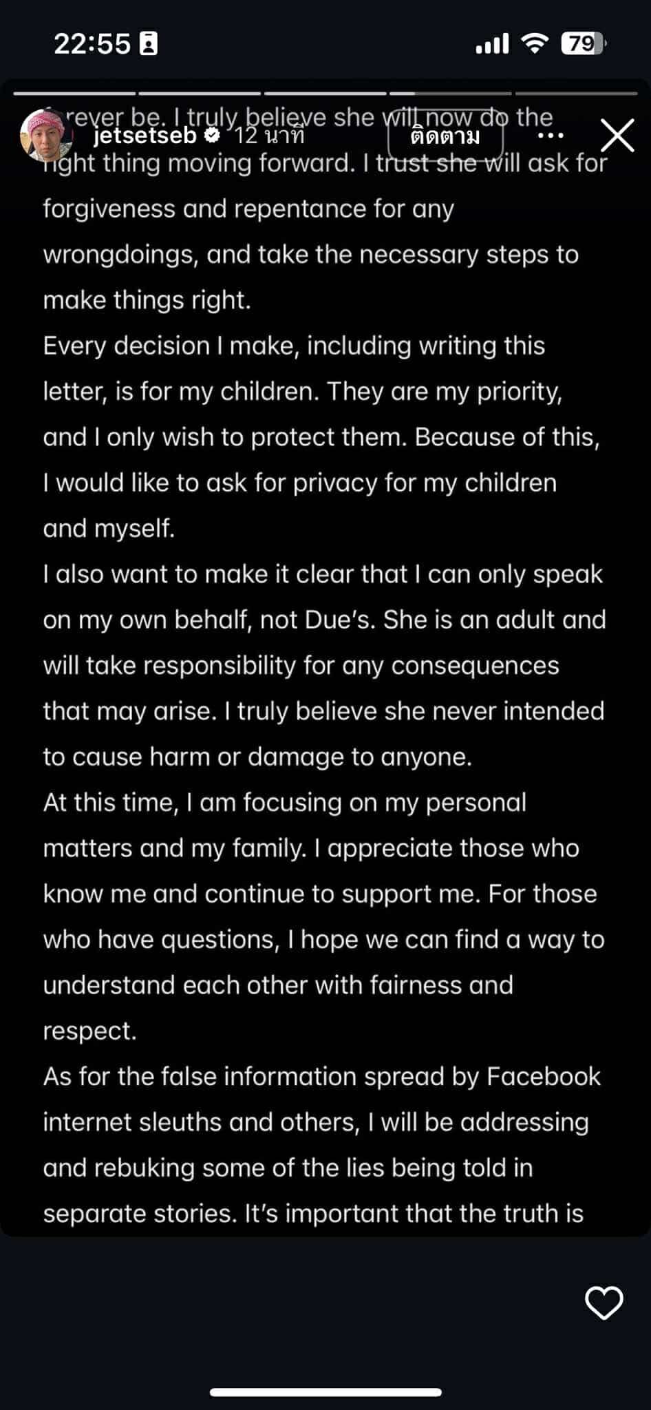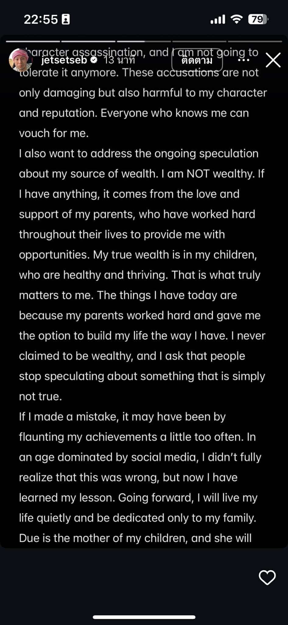 ตนเองยืนยันว่าตนและครอบครัวเป็นคนที่รักความเป็นส่วนตัว และรู้สึกไม่ปลอดภัยกับการใช้ Instagram เนื่องจากถูกนำภาพไปใช้สร้างข่าวปลอม ย้ำว่าตนไม่ได้เกี่ยวข้องกับกิจกรรมผิดกฎหมายใดๆที่เกี่ยวกับการพนันออนไลน์ คอลเซ็นเตอร์หลอกลวง และการค้าอาวุธ และยังคงรักและเคารพประเทศไทย