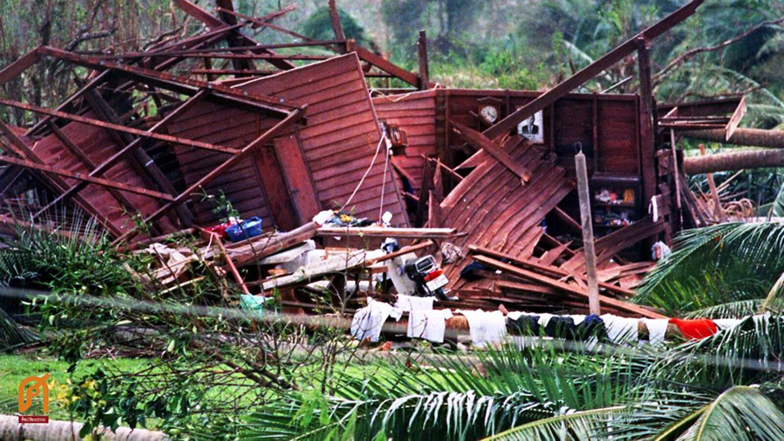 ต่อมา ทั้งลมและฝนก็พัดกระหน่ำอย่างรุนแรง หลังคาบ้าน เศษไม้ สิ่งของ ต่างปลิวกระจายว่อนไปทั่วทิศ ต้นมะพร้าว ต้นหมากแข็งแรงเพียงใดก็ล้มลงอย่างง่ายดาย แต่ที่น่าแปลกใจคือไม่มีเสียงของฟ้าร้องสักนิด ครอบครัว 4 คนพากันไปหลบพายุตรงร้านขายน้ำมันที่เป็นอาคารปูนเล็ก ๆ
