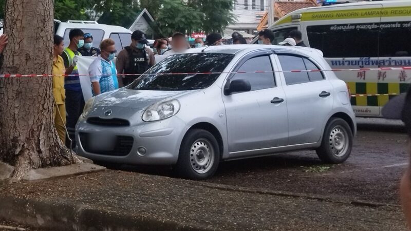 รถของผู้ตายซึ่งเป็น อดีตครูสาว ที่จอดไว้ภายในลานจอดรถของสุสานไตรลักษณ์ จ.ลำปาง