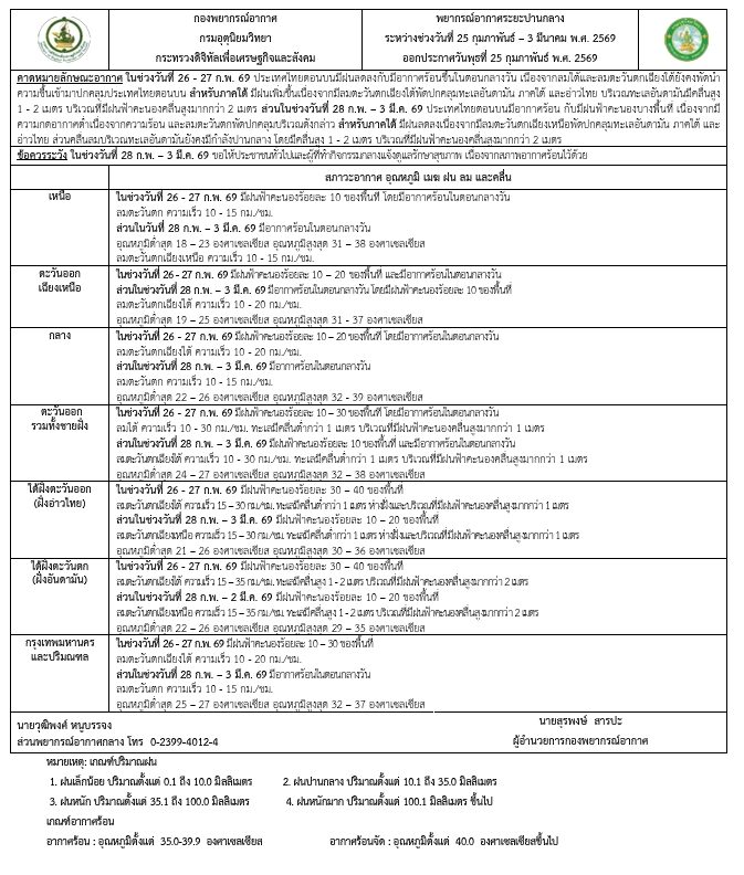 ภาคกลาง ในช่วงวันที่ 26-27 ก.พ. 69 มีฝนฟ้าคะนองร้อยละ 10-20 ของพื้นที่ โดยมีอากาศร้อนในตอนกลางวัน ลมตะวันตกเฉียงใต้ ความเร็ว 10-20 กม./ชม.