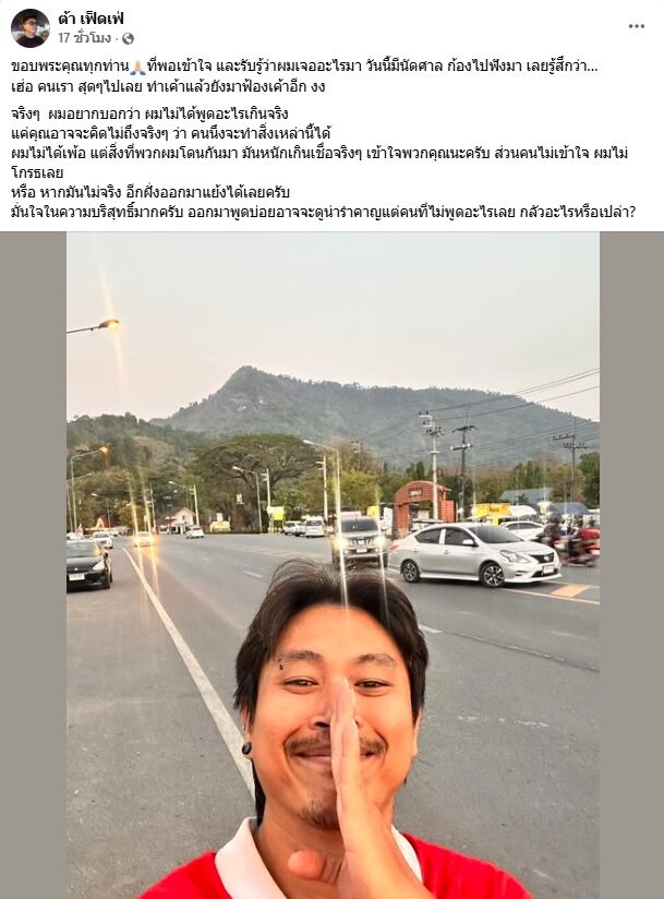 และยังโพสต์อีกว่า ขอบพระคุณทุกท่านที่พอเข้าใจ และรับรู้ว่าผมเจออะไรมา วันนี้มีนัดศาล ก้องไปฟังมา เลยรู้สึกว่า…เฮ่อ คนเราสุดๆ ไปเลย ทำเค้าแล้วยังมาฟ้องเค้าอีก งง จริงๆ ผมอยากบอกว่า ผมไม่ได้พูดอะไรเกินจริง แค่คุณอาจจะคิดไม่ถึงจริงๆ ว่า คนนึงจะทำสิ่งเหล่านี้ได้