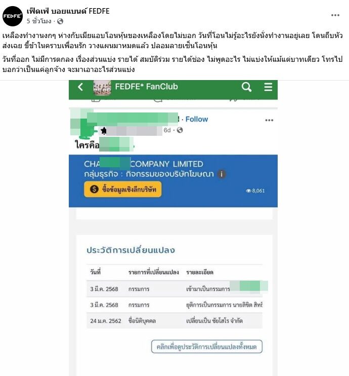 ล่าสุดวันที่ 26 ก.พ.69 เฟซบุ๊กเพจ "เฟ็ดเฟ่ บอยแบนด์ FEDFE" ออกมาโพสต์เรื่องที่ทำให้ถึงกับสะเทือนเลยก็ว่าได้ เพราะพูดถึงเรื่องปลอมลายเซ็นเพื่อโอนหุ้น โดยระบุข้อความว่า