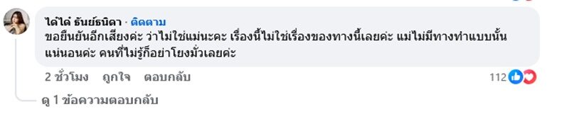 ขณะที่ ได๋ได๋ ก็เข้ามาคอมเมนต์ยืนยันด้วยว่า “ขอยืนยันอีกเสียงค่ะ ว่าไม่ใช่แม่นะคะ เรื่องนี้ไม่ใช่เรื่องของทางนี้เลยค่ะ แม่ไม่มีทางทำแบบนั้นแน่นอนค่ะ คนที่ไม่รู้ก็อย่าโยงมั่วเลยค่ะ”